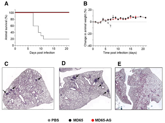 MD65 mAb-mediated post-exposure protection against SARS-CoV-2 infection of K18-hACE2 mice. Animals were intranasally infected with SARS-CoV-2 and treated two days later with 1 mg/mouse of MD65 (n = 3), MD65-AG (n = 10) or with PBS as vehicle-control (n = 10). (A) Kaplan–Meyer surviving curves. (B) Bodyweight profiles (data represents mean ± SEM). (C–E) Representative histological analysis of lung sections collected 21 dpi from MD65-AG (C), MD65 (D) treated mice, or (E) untreated mice (collected 5 dpi). Black arrows indicate lymphoid aggregates.