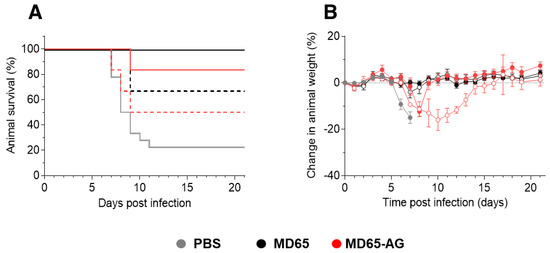 Dose-dependent post-exposure protection against SARS-CoV-2 infection of K18-hACE2 mice. Animals were intranasally infected with SARS-CoV-2 and treated two days later with either 100 µg/mouse (full lines) or 10 µg/mouse (dashed lines) of MD65 (n = 6 for each group), MD65-AG (n = 6 for each group) or with PBS as control (n = 8). (A) Kaplan–Meyer surviving curves. (B) Bodyweight profiles (empty and filled circles indicate treatment with 10 or 100 µg/mouse, respectively; data represents mean ± SEM).