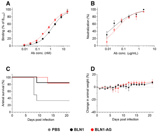 BLN1 mAb-mediated post-exposure protection against SARS-CoV-2 infection of K18-hACE2 mice. (A) Antibodies binding to immobilized SARS-CoV-2 spike protein. (B) in-vitro neutralization of SARS-CoV-2, by PRNT. (C,D) Animals were intranasally infected with SARS-CoV-2 and two days later treated with 100 µg/mouse of BLN1 (n = 6), BLN1-AG (n = 6) or with PBS as control (n = 6). (C) Kaplan–Meyer surviving curves. (D) Bodyweight profiles (data represents mean ± SEM).