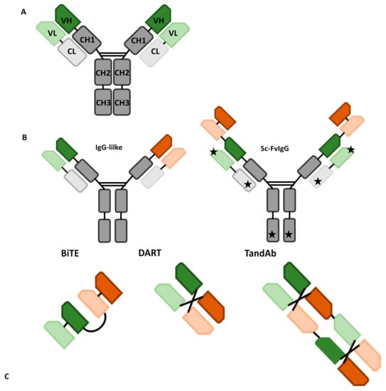 Examples of different antibodies: green and red are used for different specificities, while gray for the constant chains; and lighter colors indicate light chains, darker ones heavy chains. (A) Structure of a native antibody; CH: constant heavy chain, CL: constant light chain, VH: variable heavy chain, VL: variable light chain. (B) IgG-like antibodies; Sc-FvIgG: IgG-like antibody with added specificities through single chain fragment variables (stars indicate other sites which the ScFv can be bound to). (C) Non-IgG-like antibodies; BiTE: bispecific T-cell engager, DART: dual-affinity retargeting antibody, TandAb: tandem diabody.