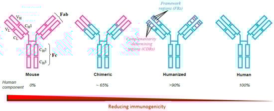 Early realization that the murine composition of the first mAbs provoked a high incidence of adverse events including anaphylaxis and cytokine release syndrome, together with their poor pharmacokinetics, led to an ongoing iterative program to reduce, and ultimately eliminate, these undesirable features [,,]. The mouse mAbs ibritumomab tiuxetan and tositumomab were soon followed by chimeric antibodies such as abciximab, cetuximab, infliximab, and others in which variable (antigen binding) regions were inserted into the constant regions of human immunoglobulins (Figure 1). Occasional serious hypersensitivities occurring after chimeric antibody infusions led to production of so-called humanized antibodies in which only approx. 5–10% of murine proteins remained after substituting mouse complementarity-determining (hypervariable) regions in place of human sequences (Figure 1). It became apparent, however, that even single amino acid changes could result in changes in antibody binding and affinity, and posttranslational glycosylation sometimes produced reductions in specificity, potency, and solubility without a reduction in immunogenicity. Development of the powerful technologies of phage display and transgenic mice finally enabled the production of fully human mAbs; however, immunogenicty can still be an occasional problem [] due to the presence of anti-idiotype antibodies and antibodies to some mAbs (anti-glycan, anti-hinge, anti-allotype, rheumatoid factors) occurring in normal sera and sera of pretreated patients.