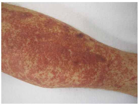 Cutaneous (hypersensitivity) vasculitis, also known as cutaneous small-vessel vasculitis and cutaneous leukocytoclastic vasculitis. Author James Heilman MD. CC BY-SA 3.0 <https://creativecommons.org/licenses/by-sa/3.0>, via Wikimedia Commons (accessed on 14 December 2021).