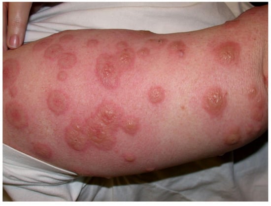Almost 40% of the 110 approved mAbs are associated with some sorts of adverse cutaneous effects, including type IV hypersensitivities [] with rare cases of life-threatening cutaneous toxidermias (Table 4, Table 5 and Table 6, Box 1). Ibritumomab has an FDA boxed warning for severe cutaneous and mucocutaneous reactions, which includes Stevens–Johnson syndrome (SJS), toxic epidermal necrolysis (TEN), erythema multiforme (EM) (Figure 3), exfoliative dermatitis, and bullous dermatitis. Warnings and precautions apply to brentuximab vedotin for SJS; rituximab has been involved in cases of SJS, TEN, paraneoplastic pemphigus, lichenoid dermatitis, and vesiculobullous dermatitis; and EM has occurred with naxitamab-gqgk therapy. EM, SJS, and psoriasis have been reported for adalimumab. EGFR-targeted mAbs are known for so-called dermatologic acneiform toxicities that are not immune-mediated (see below, Section 4.2, Cutaneous reactions).