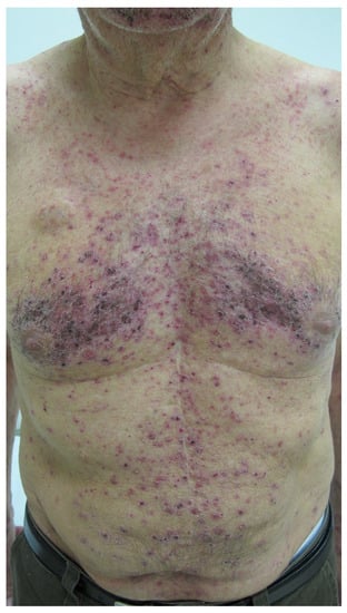 Papulopustular (acneiform) eruption on a patient during treatment with panitumumab, targeted to epidermal growth factor receptor (EGFR). From Fabbrocini, G.; Cameli, N.; Romano, M.C.; et al. Chemotherapy and skin reactions. J. Exp. Clin. Cancer Res. 2012, 31, 50. DOI: 10.1186/1756-9966-31-50 [], an Open Access article distributed under the terms of the Creative Commons Attribution License (http://creativecommons.org/licenses/by/2.0) (accessed on 14 December 2021).