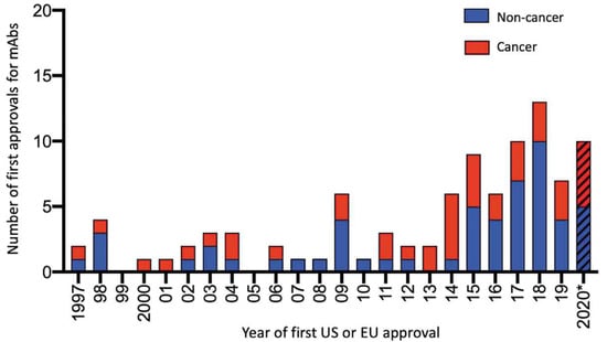 Numbers of mAbs approved by the FDA and/or EMA during the 24 year period 1997–2020. Biosimilar and Fc fusion proteins are not included. Note that in 2021, 14 mAb products were approved. *: Data publicly available as of 25 November 2020. From Kaplon, H.; Reichert, J.M. Antibodies to watch in 2021. Mabs 2021, 13, e1860476, doi.org/10.1080/19420862.2020.1860476 [], an Open Access article distributed under the terms of the Creative Commons Attribution-NonCommercial License (http://creativecommons.org/licenses/by-nc/4.0) (accessed on 14 December 2021).