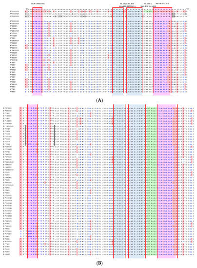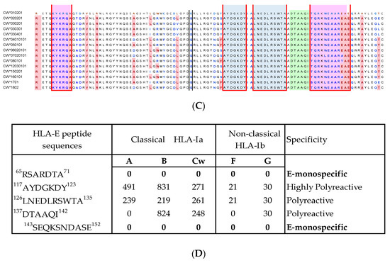 Comparative profile of the amino acid sequences of HLA-Ia alleles (HLA-A, HLA-B, and HLA-C) and HLA-Ib (HLA-E, HLA-F, and HLA-G) isoforms: HLA-Ia and HLA-Ib shared sequences and HLA-Ib and HLA-Band HLA-C shared sequences coated on the microbeads of LABScreen beadsets. (A) HLA-E,-F,-G compared with 30 alleles HLA-A coated on the LABScreen beadset; (B) 58 alleles HLA-B coated on the LABScreen beadset; (C) 15 alleles HLA-C coated on the LABScreen beadset; and (D) HLA-E amino acid sequences shared with HLA-Ia and HLA-Ib alleles.