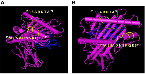 To further confirm the monospecificity, we carried out dosimetric inhibition of purified culture supernatants of TFL-033 with two HLA-E-restricted peptides, 65RSARDTA71 and 143SEQKSNDASE152, at concentrations ranging from 4.4 to 0.27 mg/well. Although both peptides showed inhibition, the α2 helical peptide SEQKSNDASE showed better dosimetric inhibition than the other peptide [37]. Figure 3 illustrates the conformational orientation of the HLA-E mAb specific epitopes on the α1 and α2 helices of HLA-E. It is important to note that the mAbs do not recognize linear epitopes but recognize conformationally altered epitopes. The yellow letters in the figures represent the exposed amino acids on the epitope, while the amino acids in the white letters represent the masked ones.