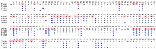 The amino acid sequences of HLA-E compared with the unique B (B*4006, B*1511) or C (C*1802) alleles recognized by a few HLA-ER or HLA-EG mAbs. The asterix in the figure illustrates amino acids, and sequences shared between HLA-E and B*4006 or B*1511 or C*1802.