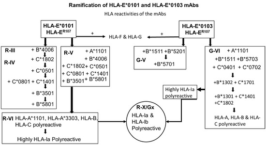 The most interesting R and G groups are those anti-HLA-E mAbs that bind to all other HLA-I loci, namely HLA-A, HLA-B, HLA-C, HLA-F, and HLA-G (R-X: n = 2 and G-X: n = 4). These are indeed considered as truly HLA-I polyreactive antibodies.