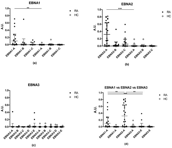 Reactivity of rheumatoid arthritis (RA) samples (n = 28) and healthy (HC) samples (n = 28) to biotinylated citrullinated EBNA1, EBNA2, and EBNA3 peptides: (a) Reactivity of RA and HC samples to EBNA1 peptides; (b) Reactivity of RA and HC samples to EBNA2 peptides; (c) Reactivity of RA and HC samples to EBNA3 peptides; (d) Reactivity of RA and HC samples to the most reactive EBNA peptides. ** = p < 0.05, *** = p < 0.001.