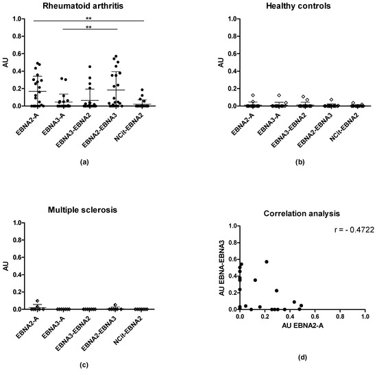 Reactivity of rheumatoid arthritis (RA) sera, multiple sclerosis (MS) sera and healthy control (HC) sera to overcrossing and N-terminal citrullinated peptides analyzed by enzyme-linked immunosorbent assay: (a) reactivity of RA sera to citrullinated peptides; (b) reactivity of HC sera to citrullinated peptides; (c) reactivity of MS sera to overcrossing peptides; (d) correlation analysis of RA antibody reactivity between EBNA2-A and EBNA2-EBNA3. ** = p < 0.01.