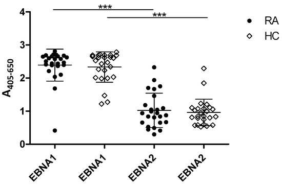 As the peptides from EBNA1 and EBNA2 performed well in our assays, the RA and HC cohorts were tested for reactivity to full-length EBNA1 and EBNA2 proteins, and elevated absorbances were found for EBNA1 protein compared to EBNA2 (Figure 3). This result conforms to the literature, where it has been reported that EBNA1 antibodies persist at a stable titer for lifetime, while EBNA2 antibodies are the first to be detected, but then decline within weeks [43]. Nevertheless, no significant difference in reactivity was revealed between the RA and HC sera. This may be due to the worldwide prevalence of EBV infection, although previous studies reported higher levels of antibodies against EBV-encoded proteins in patients with RA compared to HCs [43,48,62]. Collectively, given the hypothesis that EBV may be involved in the onset of RA, it is surprising that a significant difference between the RA and the HCs cohorts was found when testing the EBNA peptides (EBNA1-A and EBNA2-A), but no difference between RA and HC sera was detected while testing EBNA full-length proteins. This may be ascribed to the small size of the cohort tested, and remains to be analyzed using a larger cohort, as studies in the literature describe that RA sera have higher EBNA1 titers compared to HCs [62].