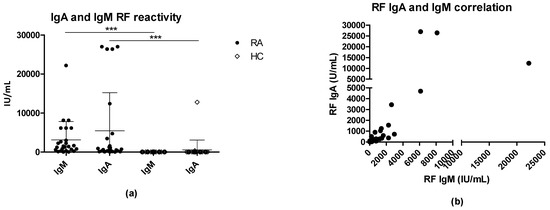 Determination of rheumatoid factor IgM and IgA in rheumatoid arthritis (RA) and healthy control (HC) samples by enzyme-linked immunosorbent assay: (a) RF IgA and IgM reactivity in RA and HC samples; (b) correlation between RF IgA and IgM. *** p < 0.001.