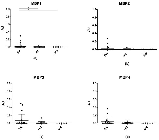 Reactivity of sera from rheumatoid arthritis (RA), multiple sclerosis (MS), and healthy controls (HC) to citrullinated MBP peptides analyzed by enzyme-linked immunosorbent assay: (a) reactivity of RA, MS and HC sera to MBP1; (b) reactivity of RA, MS and HC sera to MBP2; (c) reactivity of RA, MS and HC sera to MBP3; (d) reactivity of RA, MS and HC sera to MBP4. * p < 0.05.