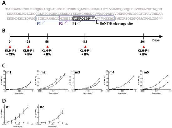 Peptide design, rabbit immunization and antibody serum levels. (A) SNAP-25 protein sequence highlighting the BoNT/E cleavage site and the peptides used in this study. (B) Animal immunization regimen using KLH-P1 in either CFA (priming) or IFA (boosting). ELISA binding curves of serum of (C) immunized mice or (D) rabbits against Bio-P1 (circles) or Bio-P2 (squares). Lines represents non-linear regression fit, and (D) points are the mean ± STD of duplicates.