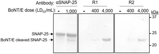 Specificity of an immunized rabbit’s sera. Differentiated SiMa cells were exposed to 0, 400 or 4000 LD50/mL of BoNT/E and lysed 24 h after intoxication. Lysates were subjected to SDS-PAGE and Western-blotted using either anti-SNAP-25 polyclonal antibody or Bio-P1 immunized rabbits (R1 and R2).