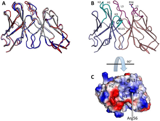 Structure prediction of antibodies. (A) Model structures of the three isolated antibodies (scFvs) indicating that all three antibodies are predicted to have very similar structures (red: SNAP1, blue: SNAP2, white: SNAP3). (B) Model structure of SNAP1 scFv with light chains colored in pink and heavy chains colored in blue. Rare Trp115 in CDR H3 (cyan sticks) and solvent-exposed Arg56 in CDR L2 (magenta sticks) are shown. (C) Electrostatic model of SNAP1 scFv shown indicating that the short CDR H3 creates a groove in the predicted structure.