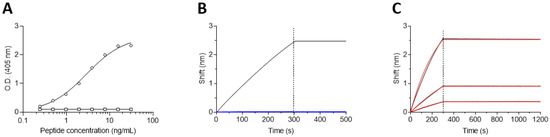 Binding studies were carried out using the Octet Red system (ForteBio, Version 8.1, Menlo Park, CA, USA, 2015) that measures biolayer interferometry (BLI) [35]. All steps were performed at 30 °C with shaking at 1500 rpm in a black 96-well plate containing 200 µL solution in each well. Streptavidin-coated biosensors were loaded with the biotinylated peptides Bio-P1 or Bio-P2 (5 µg/mL) for 300 s, followed by a wash. The sensors were then reacted for 300 s with increasing concentrations of antibody and then moved to buffer-containing wells for another 300 s (dissociation phase). Binding and dissociation were measured as changes over time in light interference after the subtraction of parallel measurements from unloaded biosensors. Sensorgrams were fitted with a 1:1 binding model using the Octet data analysis software 8.1 (Fortebio, Menlo Park, CA, USA, 2015), and the presented values are an average of several repeated measurements.