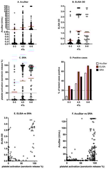 Some examples of testing for HIT according to 4T score (4Ts) and reactivity profiles. The higher the 4Ts, the more likely the presence of PF4/H antibodies. Thus, the higher the 4Ts, the higher the expected result in the AcuStar chemiluminescence assay (A), the higher the expected result by ELISA OD (optical density; (B)), and the greater the expected level of platelet activation by SRA (C) (the red dash in each score group indicates the average value for the dataset). The higher the 4Ts, the higher the expected proportion of tested cases being positive by each assay (D). The higher the titer of immunologically detected PF4/H antibodies, the more likely the positivity in functional platelet activation assays (E,F). Data shown here are historical multicenter data, including from the Westmead laboratory, as partly previously reported [9,10]. OD, optical density.