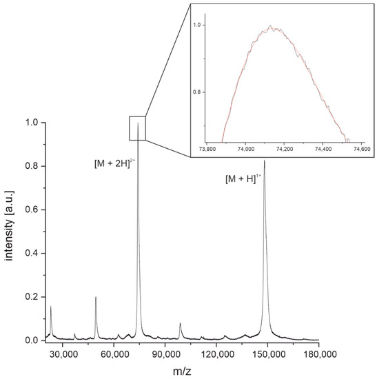 Intact masses of antibodies were determined relative to the mass of the monoclonal reference antibody NIST-mAb 8671. The purpose of this approach is the traceability of the developed method. Calibration of MALDI-TOF-MS instruments in mass ranges of around 150 kDa tends to be error-prone due to broad and asymmetric peak shapes. Smoothing of the peak maximum, as shown in Figure 1 for the doubly charged species of the NIST-mAb 8671, allows for a more reproducible way to determine the peak maximum. Smoothing (Figure 1, inset, red curve) was done with a Savitzky-Golay filter with 50 points for the entire peak. The intact mass M of the NIST-mAb 8671 was then calculated from the doubly charged species [M + 2H]2+. Triplicates were measured to determine a confidence interval of 95%. All antibodies used for this work were measured in the same way as the NIST-mAb 8671.