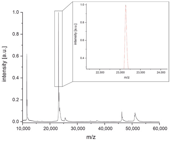 Light chain masses of antibodies were also measured relative to the light chain mass of the reference antibody NIST-mAb 8671. This also serves the purpose of traceability. Intermolecular disulfide bonds of NIST-mAb 8671 were reduced by incubation with tris(2-carboxyethyl)phosphine (TCEP) for 15 min at room temperature. Afterward, the solution was purified from excess TCEP and salts using a Zeba Spin Micro Desalting Column with a molecular weight cut-off of 7 kDa. The mass spectrum in Figure 3 shows the heavy chain at around 51 kDa, the light chain dimer at around 46 kDa, the light chain at around 23 kDa, and their doubly charged species at around 12.5 kDa. The peak at 23 kDa has a high intensity and is much sharper compared to the peak of the intact antibody shown in Figure 1. Therefore, the precision of the mass determination can be expected to be much higher.