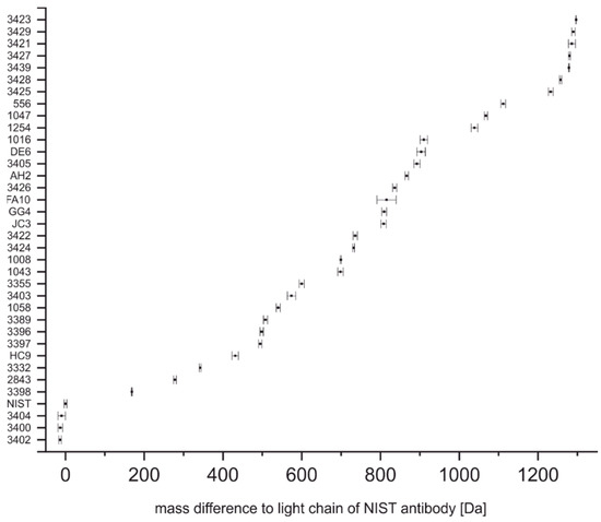 Triplicates of all antibodies used in this study were measured. The comparison of all light chain masses relative to the NIST-mAb 8671 can be seen in Figure 4, indicating a confidence level of 95%. As expected, the overlap of the confidence levels is much smaller when comparing light chain masses only. Several antibodies (17 out of 36) were unique in this set of antibodies solely based on their light chain mass. However, some antibodies still seem to have overlapping light chain masses.