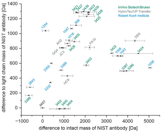 Light chain and intact masses of all antibodies relative to the NIST antibody, including their respective confidence intervals. The remaining non-unique antibodies are shown in Figure S1. Antibodies raised from immunization by InVivo Biotech/Bruker are colored in green, antibodies raised from immunization by HybroTec/UP Transfer are colored in grey, and antibodies raised by the Robert Koch Institute are colored in blue.