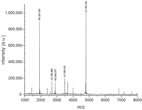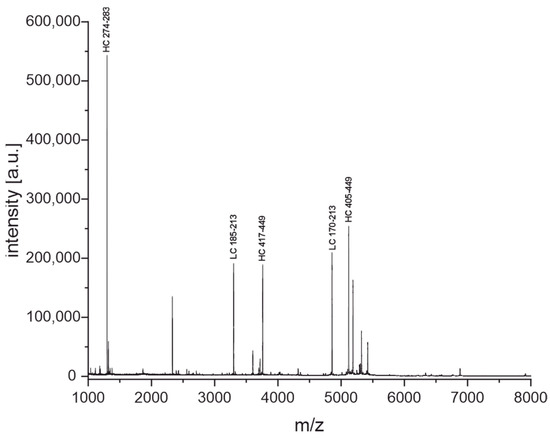 Another fingerprinting method with a complementary cleavage mechanism was developed to obtain additional peptides useful for identification. This protocol is based on the well-established enzymatic digestion with trypsin. However, in contrast to conventional tryptic digestion protocols, the denaturation of the antibody is achieved with heat rather than with chaotropic reagents such as guanidinium hydrochloride. The main advantage is that a sample clean-up prior to the addition of trypsin is not necessary [40]. After incubation of the antibody in tris buffer with 0.1 mM TCEP at 99 °C for 15 min, the sample was cooled down to 55 °C, and trypsin was added. Afterward, the peptides were purified as described in Section 3.3.1. The resulting fingerprint spectrum is shown in Figure 7. This technique also seems to produce a large amount of peptide-level information of the antibody. The five most abundant peptides were again assigned to the sequence of the NIST antibody; remaining assignments can be found in the SI (Figure S5). The sequence coverage for the NIST antibody was around 65%. It is important to note that alkylation did not improve the sequence coverage. Figure S6 in the supplementary information shows sequence coverage with and without an alkylating step. We could show that the combined sequence coverage from the fingerprints generated by acidic cleavage and tryptic digestion is around 82% (SI, Figure S7), with five out of six complementarity-determining regions (CDR) covered.