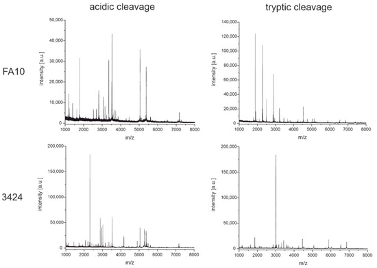 MALDI-TOF fingerprint spectra of the monoclonal antibodies FA10 and 3424 were obtained from cleavage with diluted sulfuric acid for 30 min at 99 °C and tryptic digestion for 15 min at 55 °C. Antibodies FA10 and 3424 originated from different immunizations and have different light chain and intact masses.