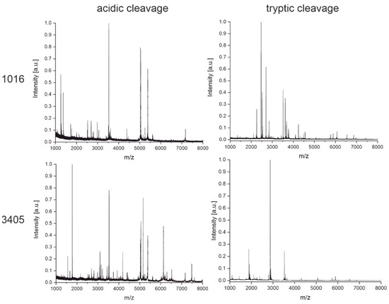 For the development of the cleavage method, we tested several weak or diluted acids for selective cleavage at aspartic residues (SI, Figure S3). Diluted sulfuric acid gave the best results regarding peak numbers and signal-to-noise ratio. The use of sulfuric acid also avoids unwanted peptide modifications such as formylation or acetylation commonly seen in the products derived from fingerprinting of proteins performed with formic or acetic acid [38,39]. To the best of our knowledge, this is the first time that diluted sulfuric acid has been reported as a cleavage agent for the generation of peptide mass fingerprints. However, it has to be noted that the cleavage mechanism can be assumed to be the same as with diluted organic acids that have previously been reported for the cleavage of proteins [27,28,29,30,31,32].