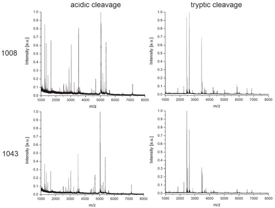 MALDI-TOF fingerprint spectra of the monoclonal antibodies 1008 and 1043 were obtained from cleavage with diluted sulfuric acid for 30 min at 99 °C and tryptic digestion for 15 min at 55 °C. Antibodies 1008 and 1043 originated from the same immunization and turned out to be identical after a later hybridoma sequencing. The similarity is evident even by a brief visual inspection.