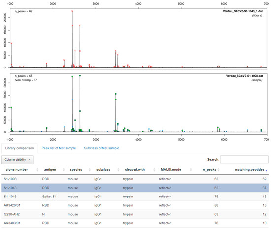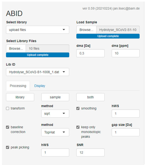 Additionally, the library contains the fingerprints of the NIST reference antibody 8671-mAb. This spectral library can be expanded by the addition of fingerprints of other antibodies and their metadata. The authors would be glad to receive antibody fingerprints from interested readers and add them to the library. The search function on the graphical user interface allows the user to filter the library. This is useful if only antibodies against a certain antigen are compared to the sample spectrum. For example, typing “RBD” in the search bar will filter out all antibodies that do not target the RBD. Contrary to the default database, the user now has the option to upload a temporary library of his own. In Figure 11, a screenshot of the user interface of ABID 2.0 is shown. Choosing “upload files” and clicking “browse” will ask the user to upload the raw data. This can be used to check if an individual sample spectrum (“load sample”) is identical to one of the spectra in the temporary library. After uploading the sample spectrum and the library spectra, several processing parameters can be chosen. For example, it is possible to alter the mass tolerance (dmz) to be in line with the quality of calibration and the resolution of the mass spectrometer. Furthermore, library and sample spectra are optionally smoothed and baseline corrected for noisy measurements. Additionally, several peak-picking parameters may be optimized if required. However, in our experience, the chosen parameters shown in Figure 11 will give satisfactory results for the majority of data.