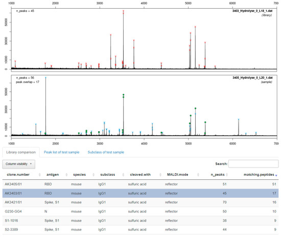 In the following, we will demonstrate how ABID 2.0 can be used to aid the spectral comparison of fingerprints. For this purpose, we used the pre-implemented default database of all SARS-CoV-2 antibodies used in this study as a reference library. Next, a sample spectrum is loaded and compared to the library. As a first example, two clones, which are undoubtedly different, but whose fingerprints appear to be rather similar, are checked. The fingerprints generated from the acidic cleavage of clones 1016 and 3405 shown in Figure 9 are chosen. The fingerprint of 3405 was used as the sample spectrum (“Load Sample”) that was compared to the default library of 36 clones (35 SARS-CoV-2 antibodies and the NIST-mAb 8671). Figure 12 shows the results of the software delivered after comparing the sample spectrum with the library. In the bottom panel, the fingerprints of the antibody in the library (including all the metadata) are sorted by the number of matching peptides (last column) with the sample spectrum. N_Peaks is the number of peaks that the software detects in total for a single spectrum, given the chosen processing parameters.