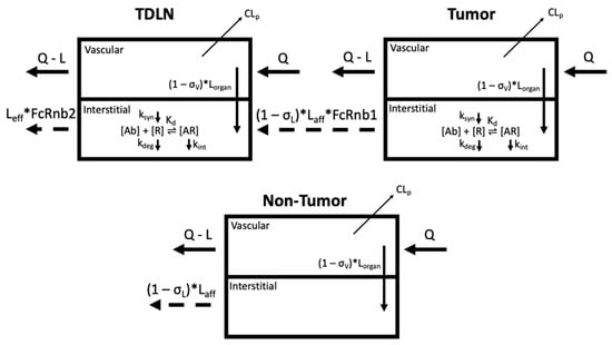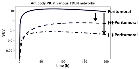 Physiologically based pharmacokinetic (PBPK) modeling allows for the quantitative analysis and prediction of drug pharmacokinetics (PK) and tissue distributions (i.e., concentration vs. time profiles) at any relevant organ. In PBPK models, physiologically relevant parameters, such as organ-specific lymph flows and lymphatic networks, can be implemented to support anatomical characterizations of antibody distribution [6]. PBPK models could define antibody distribution gradients along the organ-specific PT–TDLN axis. While there are previously reported antibody PBPK models, none to date have emphasized antibody biodistributions in anatomically distinct tumors and their TDLNs [7,8]. We have reviewed the lymphatic network and the general framework for building such a model [6]. The current work provides the first proof-of-concept PBPK model to characterize antibody distribution gradients from organ-specific tumor to TDLNs. The PBPK model serves as a valuable tool to predict antibody distribution gradients between the tumor and TDLN in a spatiotemporal manner, which has substantial implications for neoadjuvant immunotherapy.