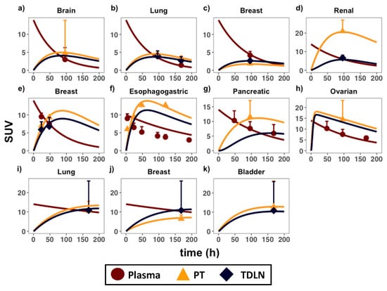 PBPK model calibration in anatomically distinctive tumors and TDLNs. Antibody distribution data in the plasma (circles), primary tumors (triangles), and TDLNs (diamonds) in eight immuno-PET biodistribution studies were applied to calibrate the model. Each calibrated plot is an organ-specific primary tumor, representing the following immunoPET-antibody pairs: (a) 89Zr-fresolimumab (glioblastoma) [16]; (b) 89Zr-bevacizumab (non-small-cell lung cancer; NSCLC) [17]; (c) 89Zr-bevacizumab (breast cancer) [18]; (d) 89Zr-bevacizumab (renal cell carcinoma) [19]; (e) 64Cu-DOTA-trastuzumab (breast cancer) [20]; (f) 89Zr-trastuzumab (esophagogastric cancer) [21]; (g) 89Zr-MMOT0530A (pancreatic cancer) [22]; (h) 89Zr-MMOT0530A (ovarian cancer) [22]; (i) 89Zr-atezolizumab (NSCLC) [23]; (j) 89Zr-atezolizumab (breast cancer) [23]; (k) 89Zr-atezolizumab (bladder cancer) [23]. SUV = standard uptake value. Data are presented as mean +/− standard deviation (SD). Please consult Appendix F for the derivation of the SUV parameter.