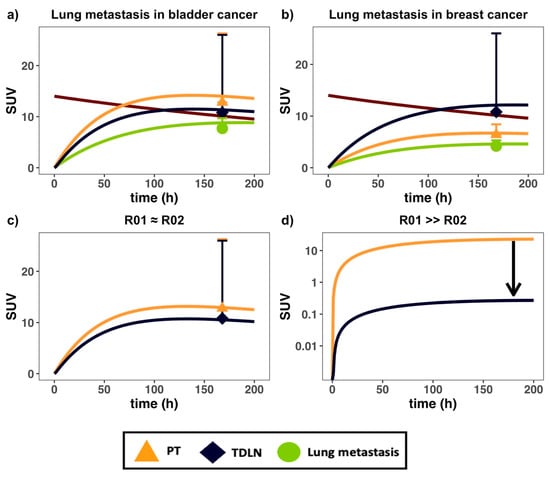 The PBPK model captured antibody distribution in lung metastases in patients with differing primary tumor types. Antibody PK data in (a) bladder and (b) breast cancer patients, both bearing lung metastases, were digitized and implemented into the model [23]; (c) effects of similar PT (red) and TDLN (green) target density (i.e., R01 = R02) on concentration gradients; (d) simulation of the effect of high PT target density relative to TDLN (i.e., R01 > R02) on gradient. The black arrow in (d) denotes the change in gradient owing to high PT metastatic target density. SUV = standard uptake value. Data are presented as mean ± SD.