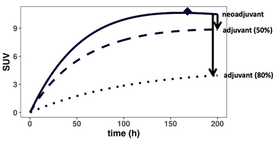 Surgical resection could drastically reduce antibody distribution into the TDLNs. Surgery (i.e., adjuvant) disrupts the local lymphatic vasculature, impairing lymph flow surrounding the tumor regions, resulting in a steeper concentration gradient (i.e., lower antibody delivery) for the residual TDLNs. The black arrows denote the change in gradient in cases where the lymph flows surrounding the residual TDLNs are reduced by 50 and 80% by the surgery, respectively.