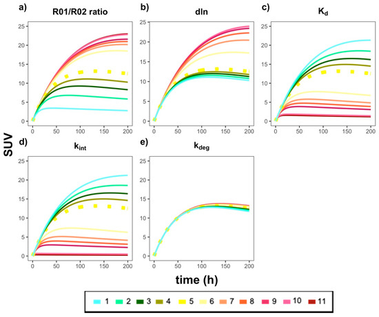 The effects of the key model parameters on antibody distribution profiles in the tumors and TDLNs. Each plot represents a specific model parameter that was adjusted by multiplying the calibrated value by the following fold changes: (1) 0.1×; (2) 0.3×; (3) 0.5×; (4) 0.7×; (5) 1.0×; (6) 3.0×; (7) 5.0×; (8) 7.0×; (9) 10.0×; (10) 50.0×; (11) 100.0×. The parameters that were adjusted, and their resulting predicted curves, were as follows: (a) R01/R02 ratio (i.e., ratio of tumor burden in the PT versus TDLN); (b) dln; (c) Kd; (d) kint; (e) kdeg. The dashed yellow line in each plot is the simulation for the calibrated (i.e., 1.0×, (5)) parameter value in the model. For best results, please view in color.