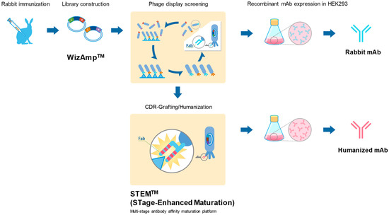 We have used a general scheme depicted in Figure 1 to generate rabbit-derived monoclonal antibodies. In general, New Zealand White rabbits were immunized with an antigen, which can be peptides that are chemically synthesized, recombinant proteins, or whole cells. The antibody libraries were constructed from the B cells of the immunized rabbits and used to screen and isolate specific clones using phage display method as previously described [16]. Antibody libraries were constructed using the antibody gene cloning method, “WizAmpTM”, as described in a published patent (US 9,890,414). Antibodies were produced with HEK293 transient expression system using pTT5 vectors harboring cloned L and H antibody chains (National Research Council of Canada, Ottawa, ON, Canada). If required, the rabbit antibodies discovered were humanized by CDR-grafting and further engineered to obtain broader specificities with Abwiz Bio’s multi-stage antibody affinity maturation platformTM (STage-Enhanced Maturation, Abwiz Bio Inc., San Diego, CA, USA).