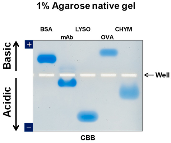 We have developed an agarose-based system in both vertical mode as in Figure 2 and horizontal mode shown in Figure 3. Detail procedure of agarose native gel electrophoresis in vertical mode has been described [32], In brief, we mainly used empty cassette from Thermo Fisher Scientific or ATTO, which has been described in detail [32]. In this review, we will mainly focus on the use of horizontal (flat) gels, based on Mupid electrophoresis apparatus as shown in Figure 3. The running buffer we adopted for agarose gels was developed by McLellan for polyacrylamide gels [32,33] and is composed of 0.1 M His/0.1 M MES, pH 6.1 [34,35,36,37,38,39]. Lower concentration of equimolar His and MES at pH 6.1 may work, but often give inconsistent results [34]. Higher concentrations occasionally work better, albeit with limited improvement. Agarose commonly used was UltraPure agarose from Thermo Fisher Scientific. When necessary, we also used high resolution MetaPhor agarose from Lonza to achieve better size separation. Agarose was dissolved with hot 0.1 M His/0.1 M MES buffer at pH 6.1. Samples were mixed with the sample buffer made of the above buffer. Figure 4 shows the Coomassie Brilliant Blue (CBB) staining of model proteins run on 1% UltraPure agarose gel. The samples were loaded at the center well position. After electrophoresis, proteins were stained by Quick CBB PLUS (FUJI-FILM Wako Pure Chemical).These five proteins migrated according to their isoelectric points and hence charged states. Negatively charged (i.e., acidic) bovine serum albumin (BSA) and ovalbumin (OVA) migrated toward the anode, while the positively charged (basic) monoclonal antibody (mAB), lysozyme (LYSO) and chymotrypsin (CHYM) migrated toward the cathode at the electrophoresis running pH of 6.1. To probe their structure states, zymography may be used as a functional assay for lysozyme and chymotrypsin. Although not an absolute proof for function, we have developed a staining method for the unfolded structure, using SYPRO Orange fluorescence dye (Thermo Fisher Scientific, Waltham, MA, USA) [39]. We have observed that this dye binds only to the unfolded structure. Although not shown here, these five proteins could not be stained by this dye diluted 5000-fold with 50 mM Tris-HCl, pH 7.4 (neutral SYPRO Orange staining solution), which stained the unfolded structures on agarose gels, suggesting their folded structures.