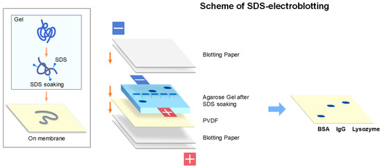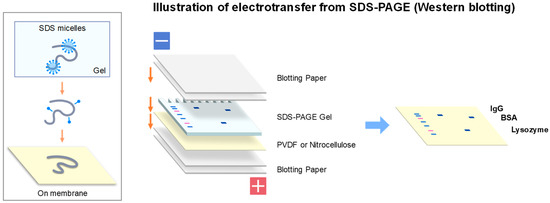 Western blotting, shown in Figure 5 as one of the most important applications of gel electrophoresis, normally implies electroblotting from SDS-PAGE gels [43,44,45]. However, there are several blotting methods available to transfer proteins from the SDS-PAGE gels. Western blotting is most frequently used and is based on the negative charges of SDS-bound protein bands separated by SDS-PAGE. They are electrically transferred (i.e., electrophoresed) from the gel to the membrane placed on the anode side, as illustrated in Figure 7. In this blotting, proteins are fully denatured upon SDS-PAGE (see inset) by SDS micelle binding and blotted to PVDF or nitrocellulose membranes placed at the anode side of electrodes as depicted in Figure 7. Other transfer methods (e.g., diffusion blotting and vacuum blotting) are also used, although less frequently. The mechanism and efficiency would be significantly different for blotting of agarose native gels from the blotting of SDS-PAGE gels. On agarose native gels, protein bands are differently charged based on their amino acid sequences both in sign and magnitude. As schematically depicted in Figure 8, some proteins may be negatively charged and others may be positively charged on the gels. In addition, some proteins may be heavily charged, while other may be little charged (or uncharged). Depending on the charged states, some proteins may be transferred to the membrane on the anode side, as in Western blotting of SDS-PAGE, while others may be transferred to the membrane on the cathode. Efficiency of the transfer could depend on the degree of net charges at the pH of the transfer. Here, we describe three transfer methods we adopted and emphasize importance of maintaining the native structure during the blotting process.