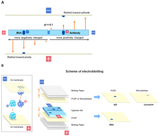 Electroblotting is the same as the Western blotting of SDS-PAGE. The net charge of the protein bands on the agarose gels is the driving force for transfer to the membranes. The major difference is the direction of the transfer, as the protein bands are charged based on their amino acid sequences and hence the isoelectric points. Positively charged proteins are theoretically transferred to the cathode side, while negatively charged proteins are transferred to the anode side, as depicted in Figure 8. In this electroblotting, a major difference occurs on transfer of basic proteins from blotting of negatively charged proteins from SDS-PAGE. As shown in Figure 8A,B, these basic proteins are positively charged and hence electrically transferred (electrophoresed) to the PVDF membrane on the cathode. We have developed the protocol to transfer proteins from agarose gels to membranes placed in both anode and cathode sides, as schematically depicted in Figure 8B where PVDF membranes are placed on both sides of the electrodes. However, we have noticed that lysozyme was not effectively transferred to the PVDF membrane at the cathode side. When nitrocellulose membrane was used at the cathode side, lysozyme transfer was effective, suggesting that highly basic proteins, such as lysozyme, may not be well bound to PVDF membrane and nitrocellulose membrane is more suitable.