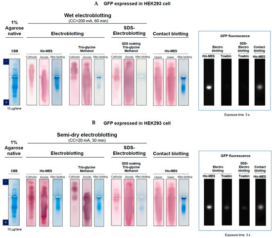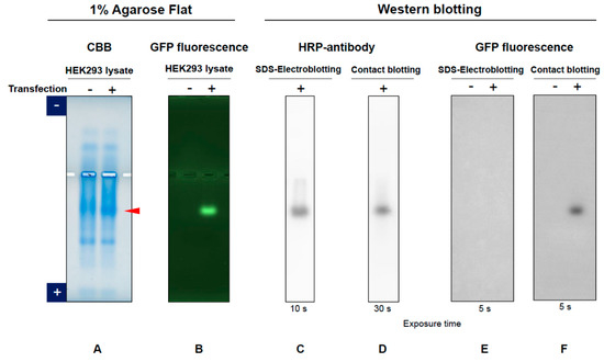 Conformation of GFP after blotting was examined using contact blotting under semi-dry condition and SDS-electroblotting under wet condition. Figure 13 shows expression of GFP in the HEK lysate. The CBB staining showed an indication of GFP band with transfection (+), as shown by arrow. This band was fluorescent when illuminated by UV light (see green GFP fluorescence in + lane). The agarose gel was blotted by SDS-electroblotting or contact blotting and stained by HRP-antibody (horseradish-conjugated anti-GFP antibody). Both blotting methods gave a band, indicating successful transfer of GFP band from the agarose gel to the PVDF membrane. Namely, this antibody bound to both native (upon contact blotting) and denatured (SDS-electroblotting) GFP and hence is conformation-indifferential. However, only contact blotting gave a fluorescent band (see + lane of contact blotting), demonstrating that contact blotting resulted in transfer of native GFP on the blot and SDS destroyed the functional structure of GFP (see + lane of SDS-electroblotting). This also indicates that exposure of GFP to SDS even below CMC on agarose gel can denature the protein. Although not tested here, it is likely that electro-blotting would retain the functional GFP on the blot, as seen in Figure 10A,B (inset).