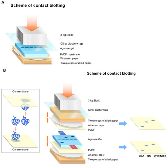 Scheme of contact blotting. (A) Contact blotting to PVDF membrane toward the bottom side. (B) Contact blotting to both upper and lower PVDF membranes. Typically, contact blotting was performed at room temperature for 5 min.