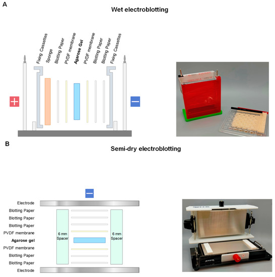 The above blotting was examined using cell lysates. The cell lysate was subjected to agarose native gel electrophoresis and stained by CBB or blotted using the above three blotting methods (i.e., electroblotting, SDS-electroblotting, and contact blotting). The electroblotting was performed under wet (Figure 12A, wet electroblotting) or semi-dry condition (Figure 12B, semi-dry electroblotting). Contact blotting was also carried out in both conditions with the setup shown in Figure 11B. Under wet condition of electroblotting, agarose gel was sandwiched by two PVDF membranes and filter papers in a horizontal mode, as depicted in Figure 12A. A sponge was inserted to reduce a sudden pressure to the gel. The entire set was then subjected to blotting in transfer buffer. Under semi-dry condition of electroblotting, a similar setup was constructed in a vertical mode, but without the sponge, as depicted in Figure 12B. Spacers (6 mm) were placed on both sides to minimize the effect of contact blotting due to the weight of the lid and to stabilize the layered structure of the gel and membranes. Contact blotting, which has no polarity, was also carried out under both wet and semi-dry conditions using a similar setup to Figure 12A,B.