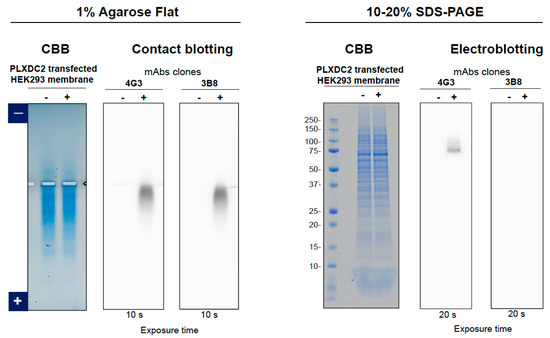Comparison of contact blotting of agarose gel and electroblotting of SDS gel using PLXDC2 antigen. Left panel, 1% agarose gel and contact blotting. Right panel, SDS-polyacrylamide gel and electroblotting (semi-dry condition). For detection of human PLXDC2 protein, antibody 4G3 and 3B8 were used on both blots of agarose gel contact blotting and SDS polyacrylamide gel electroblotting.