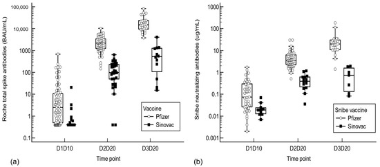 (a) Roche total spike and (b) Snibe neutralizing antibody responses after the first, second, and third dose of inactivated virus or mRNA vaccine. Abbreviations: D1D10: 10 days post-dose 1, D2D20: 20 days post-dose 2, D3D20: 20 days post-dose 3.