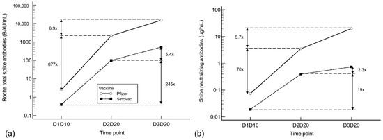 (a) Roche total S-Ab and (b) Snibe N-Ab trend at the three time points between the Pfizer and Sinovac vaccines, with the fold increase between each point. Abbreviations: D1D10: 10 days post-dose 1, D2D20: 20 days post-dose 2, D3D20: 20 days post-dose 3.