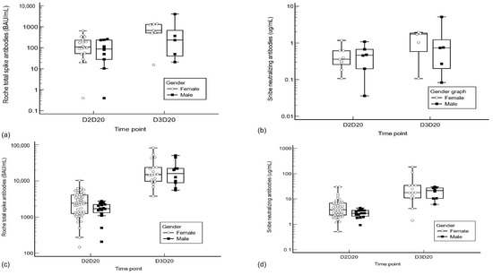 Gender group comparison of spike and neutralizing antibody responses between mRNA/inactivated virus vaccinees. (a) Roche responses in Sinovac vaccinees, (b) Snibe responses in Sinovac vaccinees, (c) Roche responses in Pfizer vaccinees, (d) Snibe responses in Pfizer vaccinees. Abbreviations: D2D20: 20 days post-dose 2, D3D20: 20 days post-dose 3.