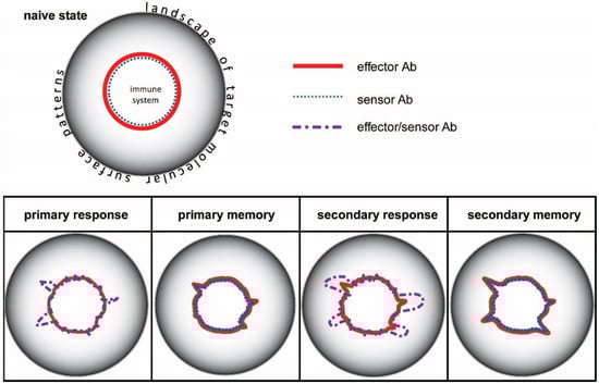 During an immune response, naïve and memory cells of the adaptive immune system are activated, expanded, and differentiated [28]. B cells in germinal centers undergo affinity maturation: somatic hypermutations introduce changes into antibody structure, followed by the selection of structural variants with higher affinity [4,5,29,30]. The process gives rise to genetically different new clones carrying antibodies with higher standard chemical potential. As long as the stimulus persists, germinal centers generate these new clones by cycles of random somatic hypermutation and selection. The result is the expansion of the system in the configuration space (Figure 2 and Figure 3): sensor-effector lymphoblasts start secreting antibodies and also increase their antibodies’ affinity by mutations [31].